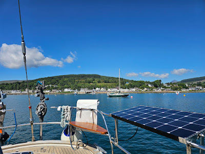 Ein wichtiges Wort beim Segeln ist "eigentlich", denn eigentlich wollten wir heute nach Sanda, einer kleinen Insel südlich der Kintyre Halbinsel und dort ankern. Aber ein Blick in den Wetterbericht heute morgen zeigte, dass abends kräftiger Wind kommen sollte der genau in die Ankerbucht weht. Daher Planänderung: wir fahren nach Campbeltown. Der Wind soll eigentlich tagsüber mit 8 kn schwach aus Osten kommen, also von hinten und der Strom beträgt 0,3 Knoten, also nicht relevant. Auch der Blick ums Boot zeigt schwachen Wind und Sonne.